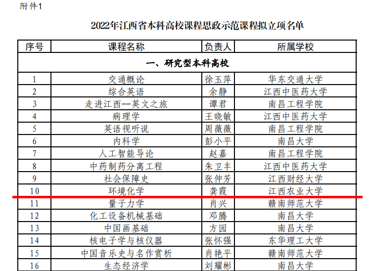 2022年12月,根据省教育厅《关于开展课程思政示范项目建设工作的通知》,经学校审核推荐,省教育厅组织专家网络评审,我校获批2项2022年本科高校课程思政示范课程(教学名师、教学团队),英国365官网龚霞教授的“环境化学”课程和教学团队被立项为江西省课程思政示范课程、教学名师和教学团队。