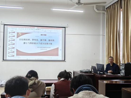 为进一步加强党员队伍建设,吸收新鲜血液,2025年3月25日下午,化材院研究生党支部于致理楼307会议室召开了党员大会,确定入党积极分子转发展对象人选,本次会议由党支部书记黄喜根老师主持,支部全体党员同志参与本次会议。
