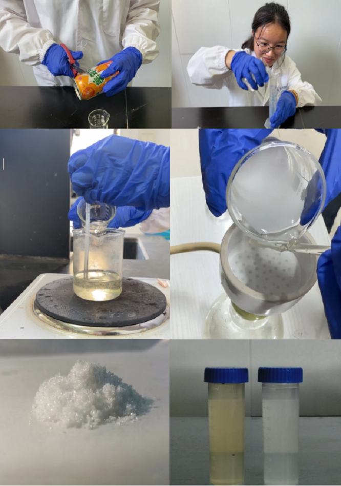 材料化学2202班胡思成、应用化学2203班胡静雯同学在谭桂霞老师的指导下,结合所学专业知识,从5月7日开始查阅资料、制定方案、准备材料并完成实验的操作,历时半月最终将废弃的易拉罐制备成净水剂—硫酸钾铝,经检测其净水效果良好,实验获得成功。材料化学2201班的郭思亲、材料化学2202班的夏艺田和应用化学2304班的王梓萌同学负责本实验的全程录像、拍照以及视频的剪辑和制作。