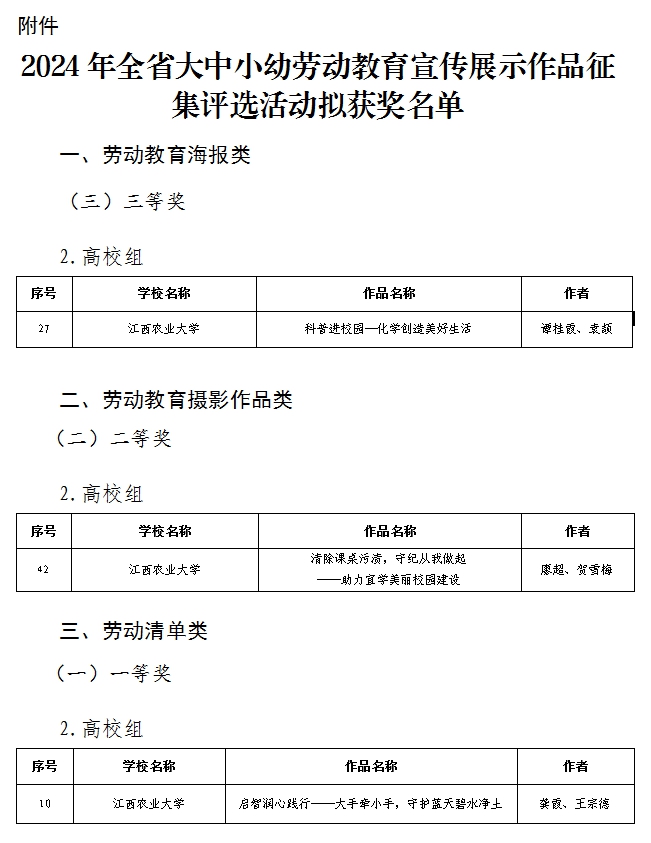 2024年12月20日,江西省教育厅发布了《关于2024年全省大中小幼劳动教育宣传展示作品征集评选活动拟获奖名单的公示》,英国365官网报送的作品在本次评选征集活动中表现突出,荣获劳动教育清单类一等奖1项(全校共4项),劳动教育摄影作品类二等奖1项(全校共1项),劳动教育海报类三等奖1项(全校共3项)。