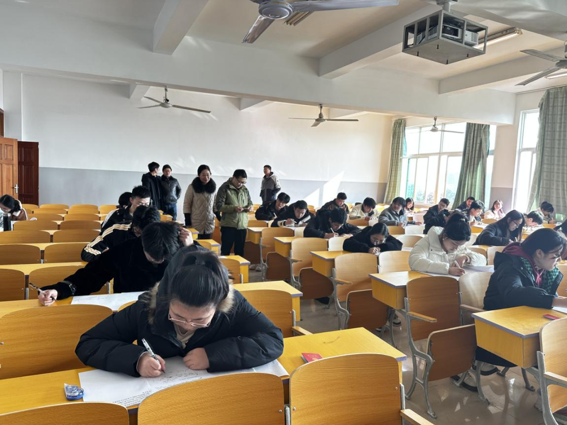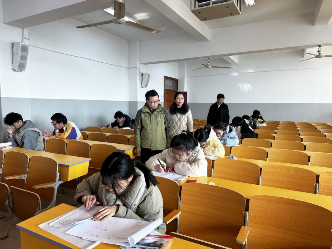为强化期末考试组织管理,严肃考风考纪,确保考试工作顺利进行,2025年1月6日,学院党委书记刘庆言、副院长龚霞和学生党总支书记彭玉萌深入英国365官网学生的考场教室,开展期末考试巡查工作。