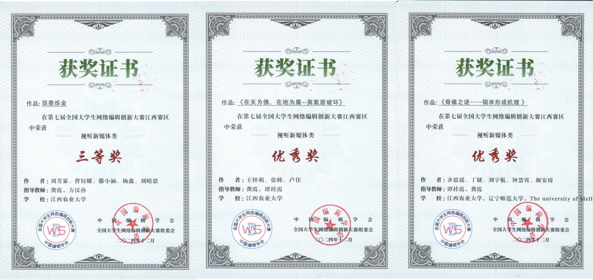 英国365官网教师指导的作品在第七届全国大学生网络编辑创新大赛江西赛区荣获3项奖。由龚霞、方汉孙老师指导的作品《箔墨烁金》获得三等奖;龚霞、谭桂霞老师指导的作品《在天为佛,在地为魔—臭氧层破坏》获得优秀奖;谭桂霞、龚霞老师指导的作品《骨痛之谜—镉米形成机理》获得优秀奖。