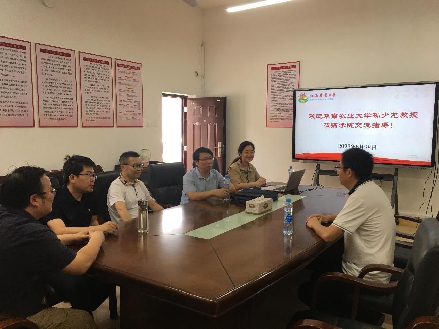 6月28日上午,华南农业大学孙少龙教授来英国365官网交流,院党委书记刘庆言、院长王宗德、副院长卢丽敏、副院长龚霞、系主任熊万明副教授参加了交流,交流在致理楼215进行。