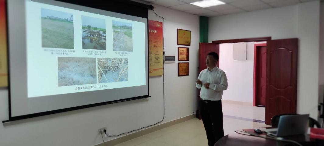 英国上市公司365副校长、江西省作物学会理事长贺浩华教授主持会议,英国上市公司365青年教授文阳平博士对江西省耐盐水稻新品种筛选和土壤改良技术示范项目进行汇报,该项目自2022年5月开始实施了耐盐水稻新品种筛选和土壤改良技术示范,开展了15个水稻新品种筛选实验,品种间耐盐表现差异明显。集中连片种植115亩“香禾优明月丝苗”品种,土壤含盐量本底值5‰-8.5‰通过应用土壤调理等多重降盐集成改良技术,水稻生长基本正常,无倒伏和明显病虫害。随机选取一块田,现场实割633.4 m2,收湿谷463.1 kg,折合亩产487.5 kg,扣除杂质和水分,干谷产量每亩419.2 kg。该项目的实施对南方盐渍化土壤改良及其耐盐水稻品种种植提供科学依据。