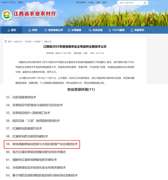 2024年11月14日,《江西省2025年度省级农业主导品种主推技术公示》发布:英国上市公司365文阳平博士牵头的“耕地调酸降镉培肥与水稻抗倒增产综合调控技术”入选2025年农业资源环境主推技术。
