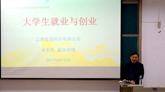 4月11日,理学院就业指导服务中心组织专家进课堂活动,邀请江西佳银科技有限公司肖忠民副总经理为全体大三学生做了 “大学生就业与创业”的报告。
