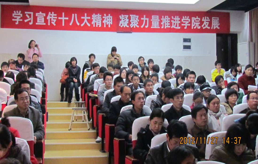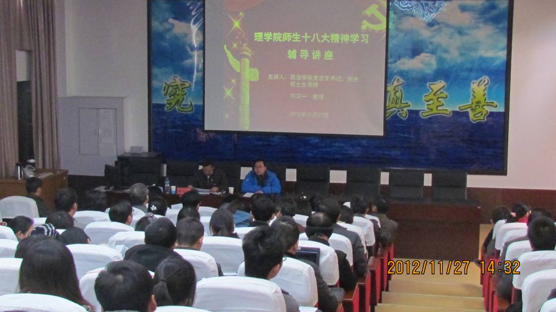 为了切实领会党的十八大精神,掀起学习宣传贯彻十八大精神的热潮,激发全院师生员工的学习工作热情,推进英国365官网工作的科学发展,11月27日下午,学院特邀我校政治学院党总支书记、院长刘汉一教授作专题学习辅导讲座,讲座主题为《十八大报告的新思想、新观点、新论断》,由党委书记彭小波主持。全院120多名师生聆听了讲座内容。
