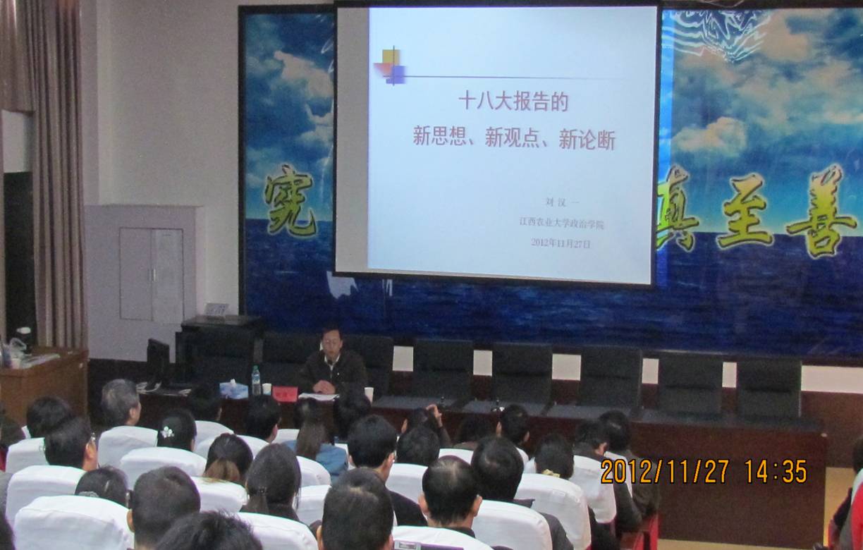 刘汉一教授先对十八大报告的评价、意义及内容进行了简要讲述。随后刘教授通过大量详实的案例和数据,从报告为大会确定的主题、对科学发展观做出新的历史定位、对“中国特色社会主义”做出新的阐述、对中国特色社会主义事业做出新部署等多个方面阐述了十八大报告中的新思想、新观点、新论断。刘教授论点精辟,语言风趣,让师生们更全面了解、学习和领会了十八大精神,开启了英国365官网学习宣传十八大精神的序幕。