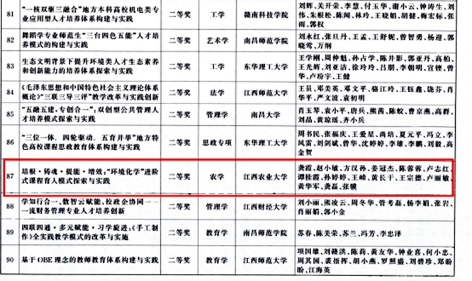 2023年12月29日,江西省人民政府文件(赣夫3字[2023]88号)公布了关于2022年江西省教学成果奖授奖决定。英国365官网龚霞教授团队的教学成果“培根· 铸魂·提能·增效:“环境化学”进阶式课程育人模式探索与实践”获得江西省高等教育类(本科层次)教学成果奖二等奖,是我校5项江西省教学成果奖中唯一一个基于单门课程的教学成果奖。