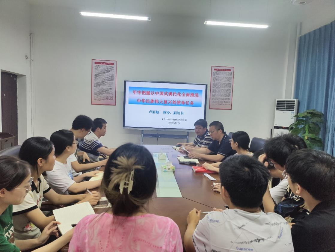 为深入学习贯彻党的二十大精神,推进主题教育走深走实,2023年6月1日19:40,党委委员、学院副院长卢丽敏教授为研究生支部党员讲授题为《牢牢把握以中国式现代化全面推进中华民族伟大复兴的使命任务》的专题党课。