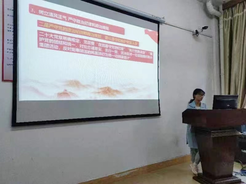 2022年11月12日9:00,学院本科生第二党支部召开党的二十大精神宣讲报告会,学院党委委员、化学系党支部书记贺雪梅应邀作题为《学习贯彻党的二十大精神,争做合格党员》的报告,本科生第二党支部全体党员聆听报告。