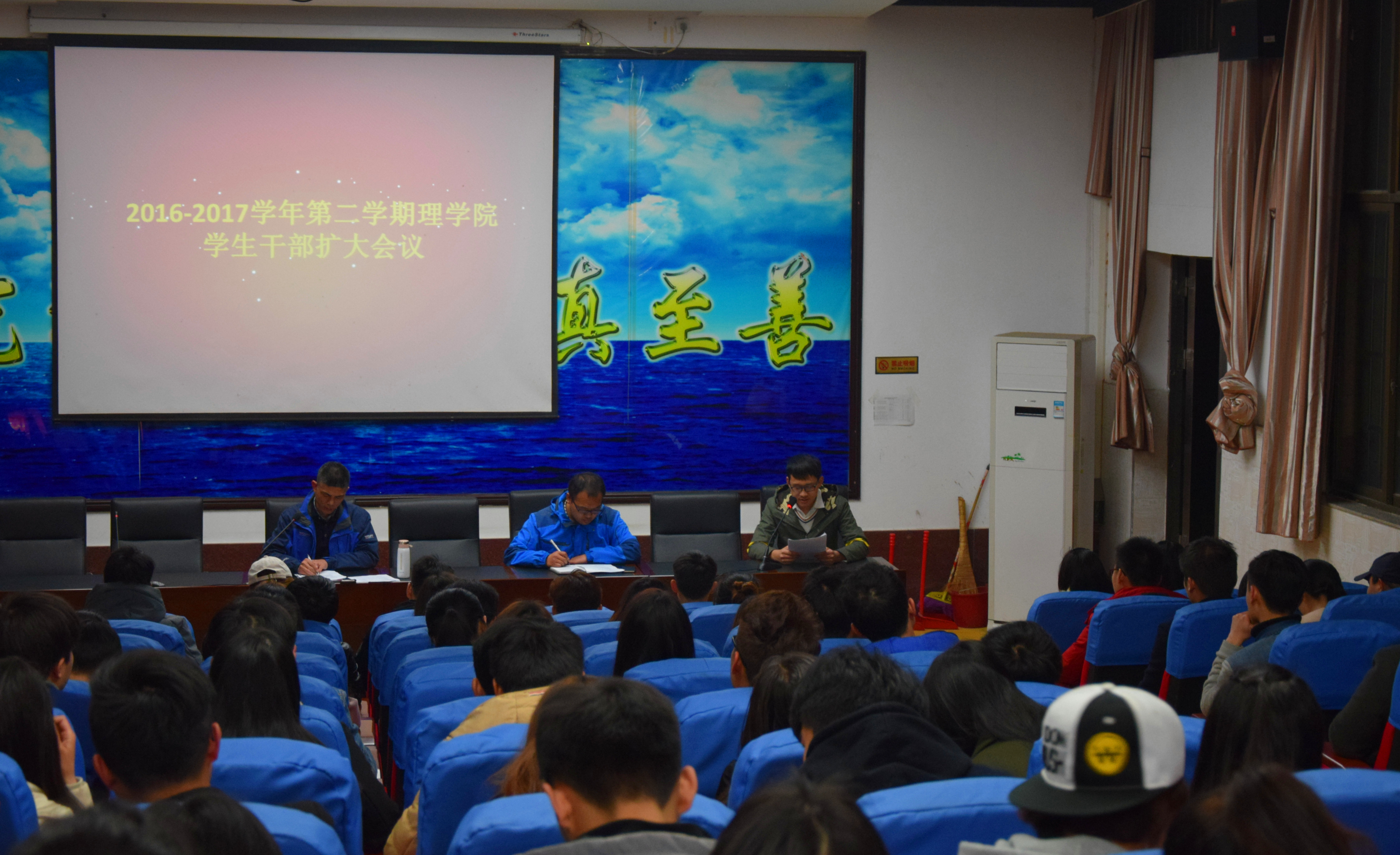 2月14日,新学伊始,理学院召开2016-2017学年第二学期理学院学生干部扩大会议。团委学生会副部及以上委员,理学院各班班长、团支书、学习委员和心理委员。理学院党委副书记周国平,学院辅导员廖超、胡文韬参加本次会议。会议由廖超主持。