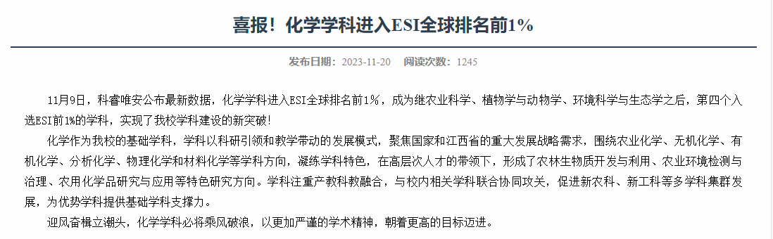 学科建设有实效。2023年11月9日,化学学科进入ESI全球排名前1%,成为继农业科学、植物学与动物学、环境科学与生态学之后,第四个入选ESI前1%的学科,实现了我校学科建设的新突破!学科以科研引领和教学带动的发展模式,围绕农业化学、无机化学、有机化学、分析化学、物理化学和材料化学等学科方向,凝练学科特色,在高层次人才的带领下,形成了农林生物质开发与利用、农业环境检测与治理、农用化学品研究与应用等特色研究方向。