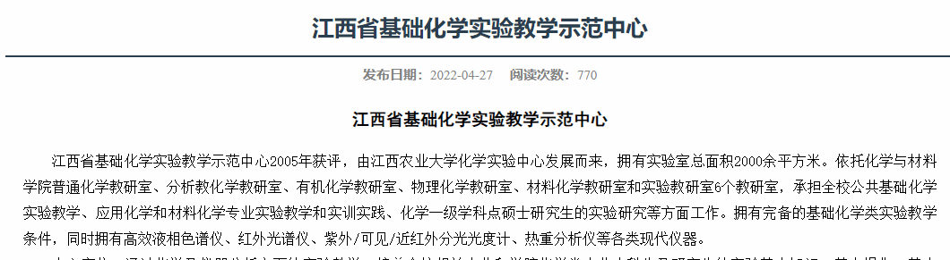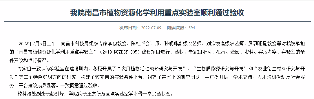 平台建设有实效。基于教学研究型学院定位,学院围绕“建平台、组团队、育成果”的工作思路,于2019年获批南昌市重点实验室1个,实现市级重点实验室零的突破。目前,学院已拥有江西省基础化学实验教学示范中心、南昌市植物资源化学利用重点实验室、南昌市有机功能材料与农业应用优势科技创新团队、英国上市公司365功能材料与农业应用化学研究所、5个校外研究生联合培养基地等研究机构,为师生提供了良好的科研平台。