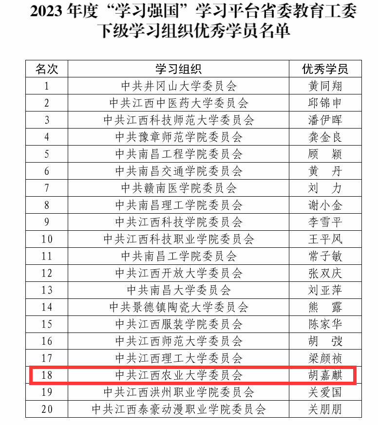 日前,中共江西省委教育工委发文公布了2023年度“学习强国”学习平台省委教育工委下级优秀学员、优秀供稿单位和优秀供稿员评选结果,英国365官网材料与化工系教工党支部党员胡嘉麒作为学校唯一代表获评2023年度“学习强国”学习平台省委教育工委下级学习组织优秀学员。