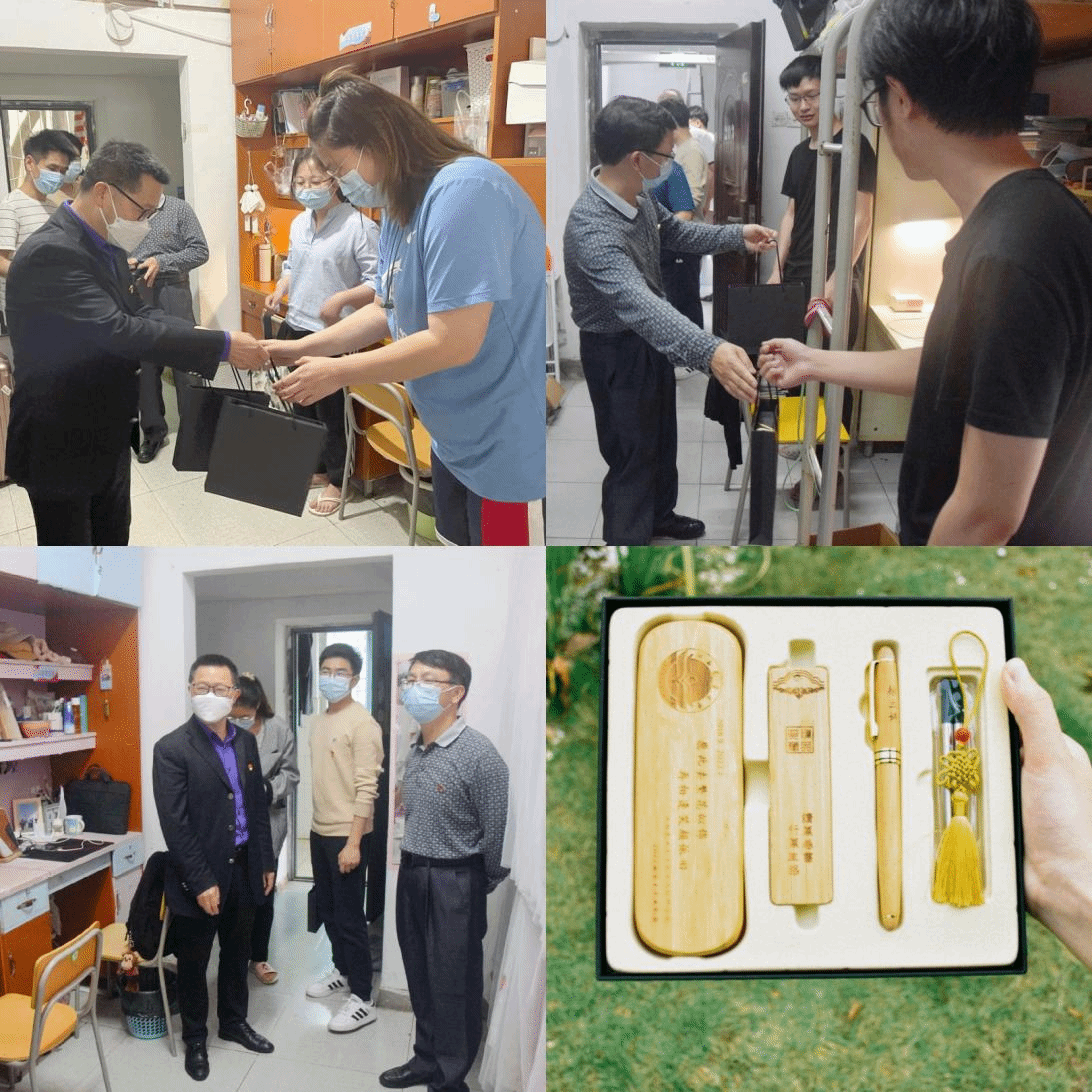 为了解关爱学生学习生活,强化对学生的服务和管理,4月26日,学院党委书记刘庆言、院长王宗德、毕业班班主任及学工办老师来到毕业生寝室为毕业生发放定制专属纪念品,一支笔、一枚书签、一个笔盒,寓意着学院希望每一位毕业生都能用“笔”书写好自己的人生之路。在学生寝室,学院党委书记刘庆言与毕业生进行亲切交谈,关心同学们的学习和生活状况,嘱咐大家要严格遵守疫情防控规定,加强理论学习和体育锻炼,助力打赢疫情防控阻击战。院长王宗德勉励大家要加强学习、刻苦钻研,树立时刻学习、终身学习的观念,努力成为爱创新、敢创新、勇创新的时代新人。疫情期间,为应对突发紧急情况,学院制作发放“师生齐肩、共克时艰”疫情防控紧急联系卡,全体专职辅导员24小时保持联络畅通,真正做到耐心服务不打烊、细心关怀不断线。