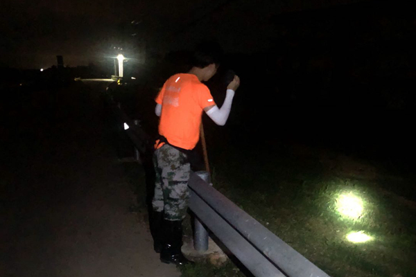 “我们的工作,是巡查堤坝、查看内侧是否有暗涌出现、水位是否有较大的变化以及查看一切可能导致危险情况的迹象”。凌晨三点的堤坝上灯光点点,李文斌打着手电筒和其他突击队员一起仔细检查着堤坝各处情况,确保没有遗漏可能存在的安全隐患。