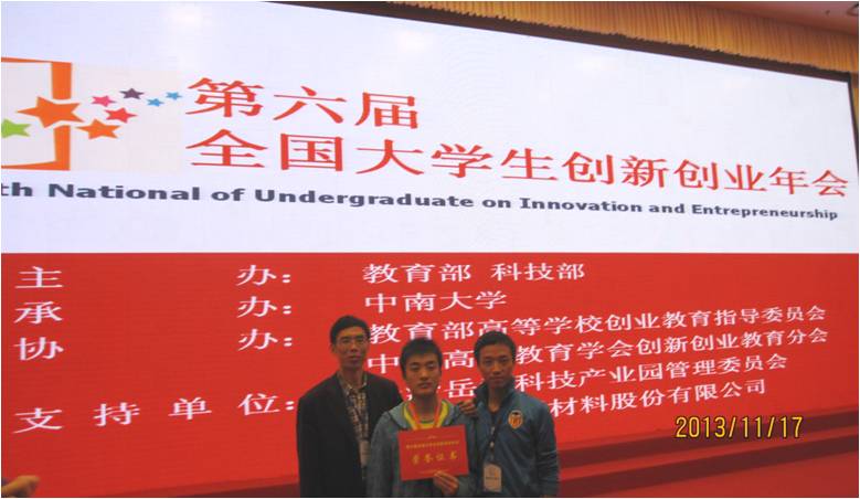 2013年11月15日至17日,第六届全国大学生创新创业年会在湖南长沙中南大学举行。由英国365官网刘光斌老师指导,本科生陈伟等同学完成的学术论文《野生能源物—东京野茉莉制备生物柴油》成功入选入选本次大学生创新学术年会。英国365官网刘光斌老师、校学工处陈家兴老师和2010级陈伟同学代表学校出席大会并做了交流报告。教育部、科技部相关领导出席大会并致辞。