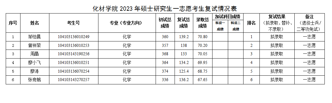 附件:化材学院2023年硕士研究生一志愿考生复试情况表