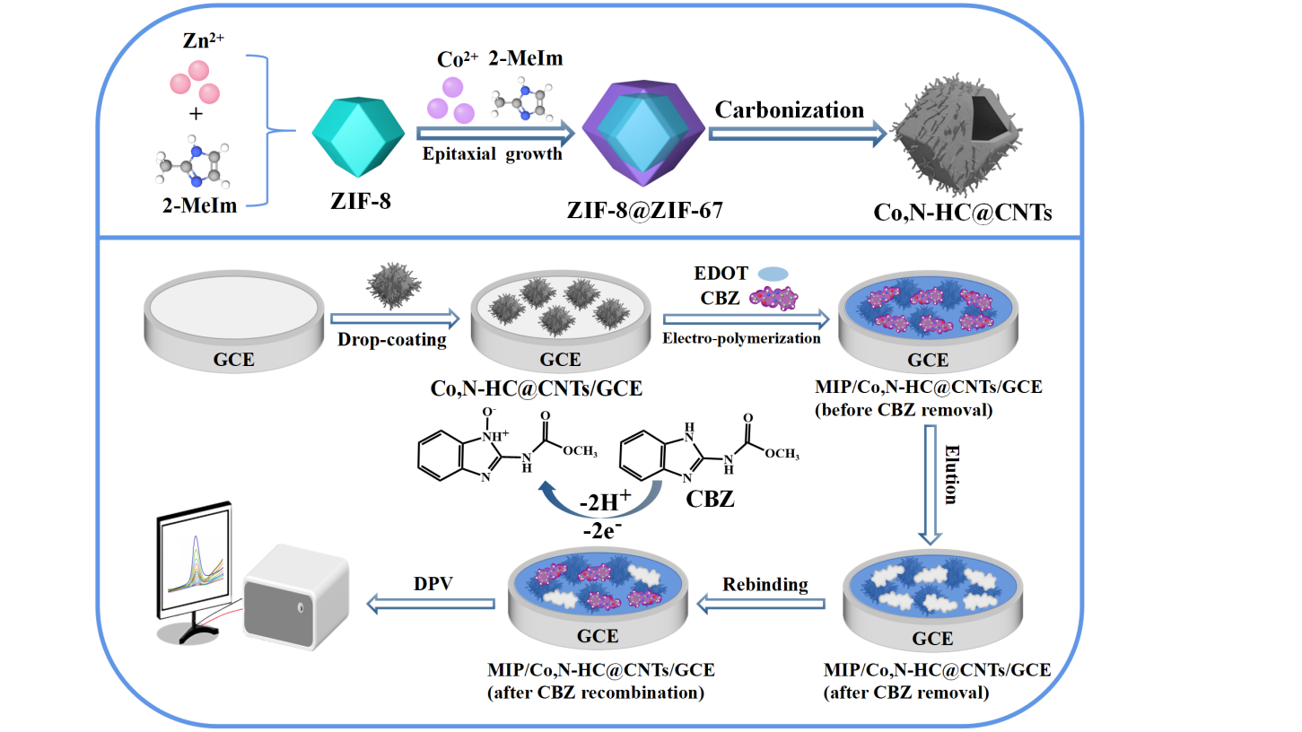 针对这些问题,本文合成了一种新型金属有机框架衍生的中空Co,N-HC@CNTs,将其与导电PEDOT分子印迹膜相结合,构建了分子印迹电化学传感器用于CBZ的检测。传感体系中,Co,N-HC@CNTs独特的中空结构和表面大量的碳纳米管赋予其优异的电催化活性,有效提高了检测灵敏度。导电PEDOT分子印迹膜不仅提高了对CBZ的选择性,还进一步放大了响应信号。所构建传感器对CBZ的检测限低至1.67 pM。此外,该传感器也表现出良好的选择性和重现性,同时成功应用于蔬菜和水果样品中CBZ的检测。