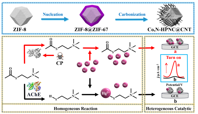 酶抑制电化学传感器是一种很有前途的检测有机磷农药(OPs)的策略。然而,酶的稳定性差和硫胆碱信号探针的高氧化电位限制了它们的应用潜力。针对这一问题,研究人员提出了一种将均相反应和异相催化相结合的间接策略,以实现对毒死蜱(CP)的高灵敏度和可靠检测。在均相反应中,由于硫代胆碱(TCh)是乙酰胆碱酯酶(AChE)催化的乙酰硫代胆碱(ATCh)的水解产物,氧化电位较低的Hg2+因其电极活性可被硫代胆碱抑制,因此本研究采用了Hg2+作为检测CP的信号探针。此外,ZIF-8@ZIF-67衍生的钴、氮掺杂的中空多孔碳纳米笼@碳纳米管(Co,N-HPNC@CNT)用作高性能电极材料,实现Hg2+的剥离伏安信号放大。由于二者的协同作用,该传感器具有优异的传感性能、出色的稳定性和良好的抗干扰能力。