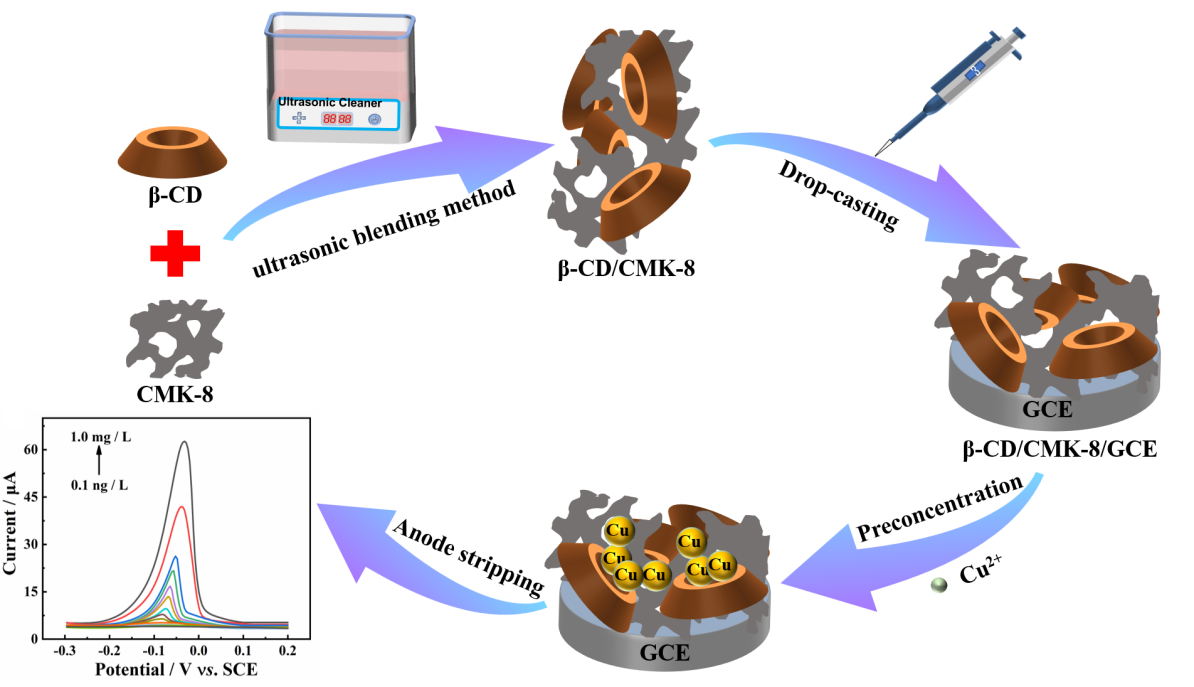 该论文基于β-Cyclodextrin/CMK-8复合材料构建了一种新型电化学传感平台,用于Cu2+的电化学检测研究。β-Cyclodextrin通过配位效应与Cu2+结合,可以实现对Cu2+的选择性吸附。同时,CMK-8能显著增强复合材料的电子传输能力,提高Cu2+的电催化性能。基于材料组分之间的协同效应,该传感器对Cu2+检测的线性范围为0.1 ng·L−1到1.0 mg·L−1,检测下限为0.3 ng·L−1。同时,该传感器还具有良好的重复性、重现性和选择性,并成功应用于自来水中Cu2+的定量测定。