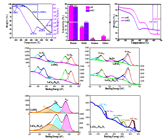 鉴于此,本论文构建了单酚选择性高及抗积碳性能良好等功能的稀土LaFe1-xCuxO3钙钛矿用于工业碱木质素的异位催化热解生产高品质生物油。与非催化相比,所构建的稀土LaFe1-xCuxO3钙钛矿对单酚(~79%选择性)和单环芳烃的生产表现出优异的活性。尤其是Cu掺杂后的脱氧能力更强,更有助于形成单环芳烃(选择性>21%)。总的来说,这项工作为构建LaFeO3基钙钛矿催化剂适用于工业木质素生产单酚和单环芳烃提供了一种可扩展的策略。