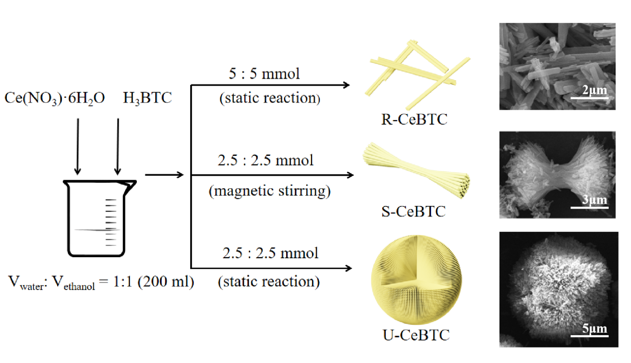 金属有机框架化合物(MOFs)是一种由氧、氮等多齿状有机配体自组装而成的新型多孔材料。本文基于MOFs结构多样性、可设计性和可定制性等优点,通过改变制备条件合成了棒状、稻草状和海胆状Ce-BTC,并以其为前驱体,采用浸渍法制备了系列CuO/CeO2催化剂,系统研究了Ce-BTC前驱体形貌对CuO/CeO2催化剂物性结构、表面状态及催化性能的影响。