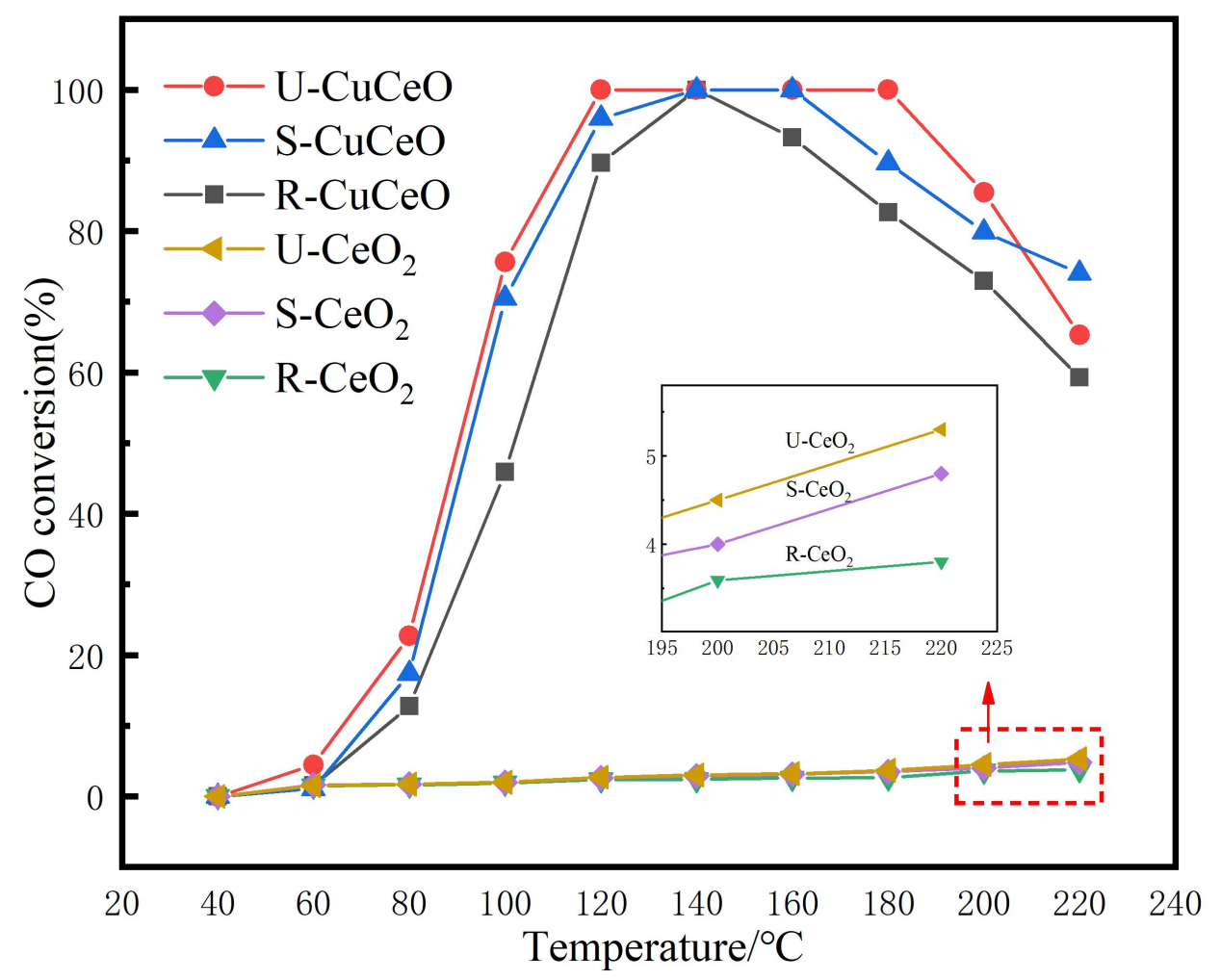 质子交换膜燃料电池(PEMFCs)是一种清洁、高效的新能源,以氢气为燃料。然而,工业大规模生产的氢气通常含有约2wt%的CO,其会导致燃料电池的Pt电极中毒使电池失去活性。在众多去除CO的方法中,CO的优先催化氧化(CO-PROX)是最经济、高效的方法之一。CuO/CeO2催化剂由于其低温下良好的催化性能和低成本的优势,近年来受到广泛关注。