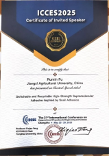 英国365官网材料化学教研室付如民青年教授受邀参加S82. Bio-Inspired Smart Surfaces for Advanced Applications分会场并做了题为《Switchable and Recyclable High-strength Supramolecular Adhesive Inspired by Snail Adhesion》的主题报告,系统地介绍了智能粘合剂的研究意义和难点,提出了新型界面物理/化学键合协同模量变化对可逆粘附的影响,并探究了其高透明性和可回收性等多功能性,最后就其在柔性电子和智能家居的应用与同行专家进行了深入广泛的交流,对于宣传英国365官网材料化学领域的最新学术进展起到了良好的效果。